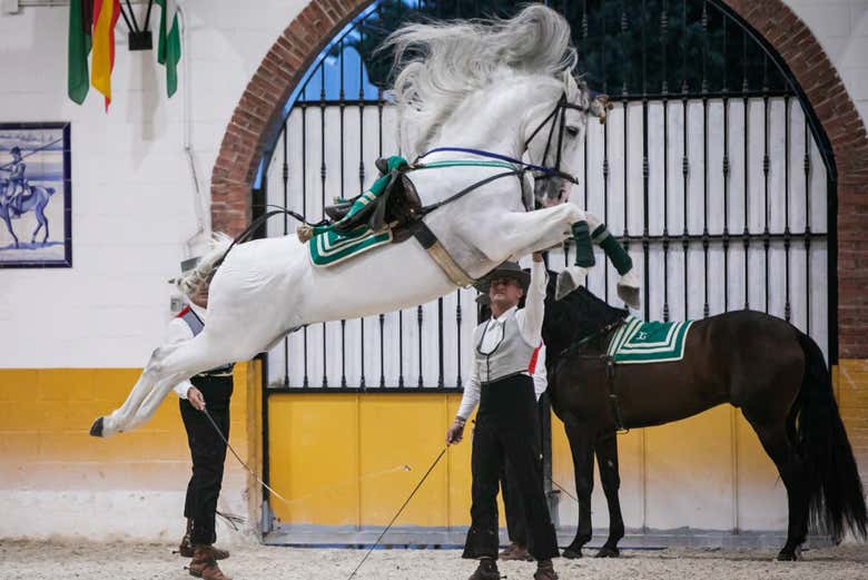 Throughout the evening, you'll have the chance to admire more than 20 horses performing routines such as Magia Ecuestre (Equestrian Magic), Fantasía de Feria (Fair Fantasy), Sueño de Amazona (Amazonian Dream), and Carrusel de Alta Escuela (High School Carousel), featuring riders alongside flamenco dancers and singers. Don't miss it!