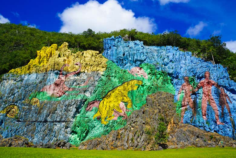 Then, after 40 minutes enjoying the zipline, we'll hop on our scooters and head to the iconic Mural of Prehistory, a masterpiece by Leovigildo González, a painter who represented the evolution over a colossal mogote in the Viñales Valley. How long did it take him? How did he reach the highest parts of the rock? You'll find out!