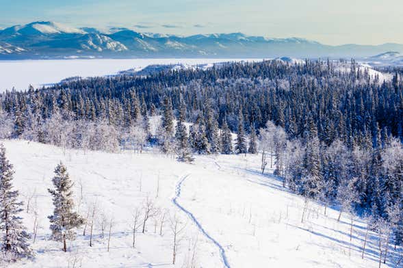 Accompanied by a guide, we'll put our snowshoes on, similar to those used in the past by miners, hunters and fur traders, to trek through the Canadian frozen land. We'll explore tranquil nature and the amazing views across Whitehorse, where we'll also come across many different animal species including foxes, coyotes and Canadian roosters.