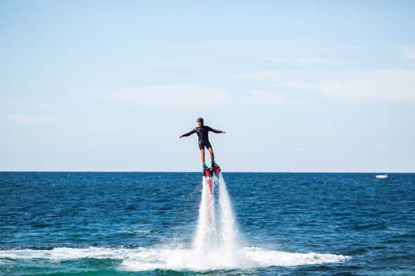 Cada miembro del grupo, será impulsado por un cañón de agua hasta unos 12 metros de altura. ¡Podréis hacer piruetas y giros sobre el Mediterráneo! Se trata de una experiencia muy especial, en la que creeréis estar volando sobre el mar. ¡Recordaréis este momento para siempre!