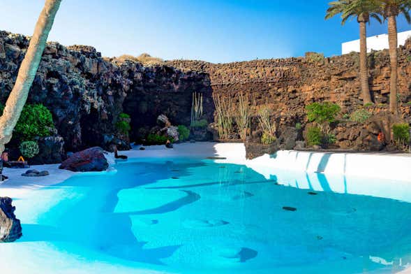 Bordearemos el volcán de la Corona y el Malpaís de la Corona y haremos la parada estrella del tour en los Jameos del Agua. Al entrar en la famosa cueva, formada por las erupciones volcánicas, contemplaremos la bella combinación del agua cristalina con el color negro de la lava petrificada. ¿Sabíais que en su interior habitan pequeños cangrejos blancos?