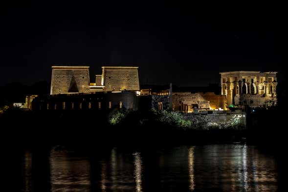 Recorreremos el Templo de Philae acompañados por la diosa Isis y el dios Osiris, quienes nos narrarán su historia de amor y tragedia. ¿Sabíais que estos dioses eran marido y mujer? Durante dos horas y media, reviviremos su historia y aprenderemos sobre la mitología egipcia mientras las paredes del templo cobran vida con el espectáculo de luces. ¡Será una experiencia única!