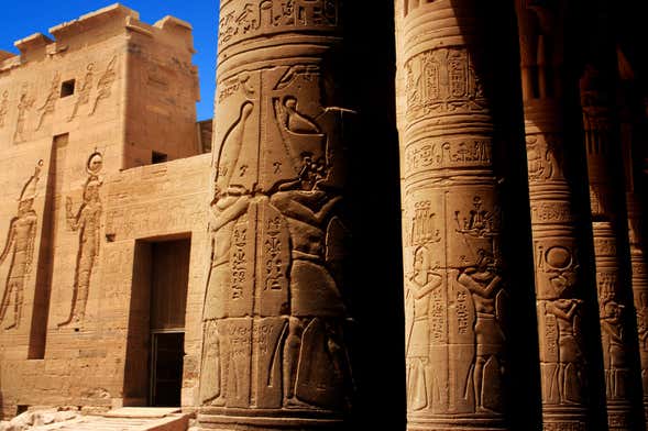 Dejando atrás la cantera nos dirigiremos a la isla de Agilika, entre la antigua y la nueva Presa de Asuán, donde se encuentra el precioso Templo de Filae. Este templo está dedicado a la diosa Isis y es uno de los 4 lugares donde sucede la leyenda de Isis, Osiris y Horus.