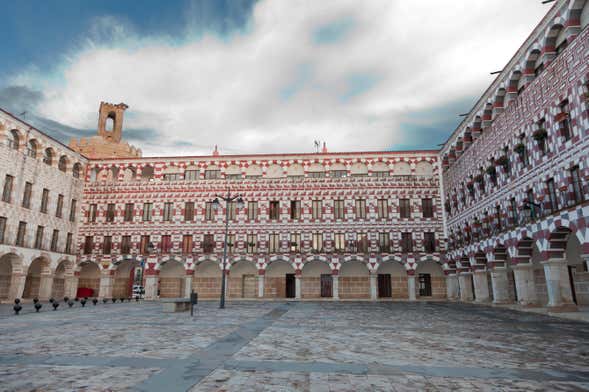 Saldremos del recinto amurallado por la Puerta del Capitel, de origen almohade, y llegaremos a la Plaza Alta. ¡Fijaos en las fachadas de las Casas Coloradas! Después seguiremos hasta la Plaza de España, donde se alza el Ayuntamiento de Badajoz y la Catedral de San Juan Bautista, que destaca por su torre de 41 metros de altura.