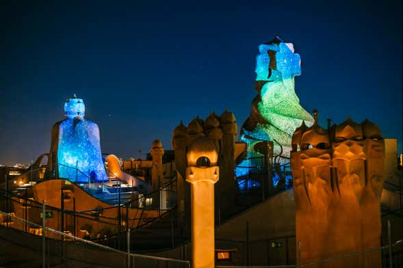 Tras la visita guiada, subiremos hasta la famosa azotea para disfrutar del espectáculo audiovisual La Pedrera Night Experience. Las célebres chimeneas o “badalots” de la Casa Milà se transformarán entonces en gigantescas pantallas sobre las que se proyectarán diversos juegos de luces, colores y formas a través de las más modernas técnicas de videomapping. Las escenas están sincronizadas con la música, creando una conjunción perfecta entre imagen y sonido.