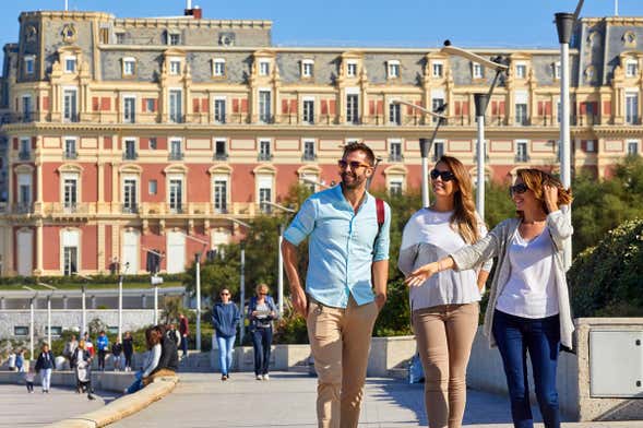 En un extremo de la playa nos detendremos ante uno de los edificios más bonitos de la ciudad: el Hôtel du Palais. Frente a su fachada conoceremos la historia del matrimonio formado por Eugenia de Montijo y Napoleón III, promotores de este hotel-palacio.