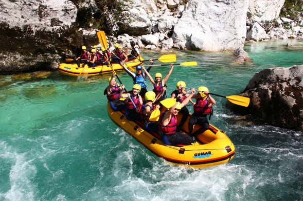 Saltaremos los rápidos, sortearemos obstáculos y, durante una hora y media, descubriremos las aguas eslovenas desde dentro. Y no todo va a ser remar. Las balsas se convertirán en toboganes que nos permitirán deslizarnos y sumergirnos en el río Isonzo.