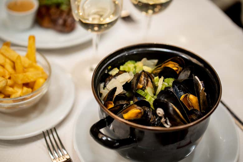 - Mejillones en cerveza Lambic Boon con patatas fritas belgas.