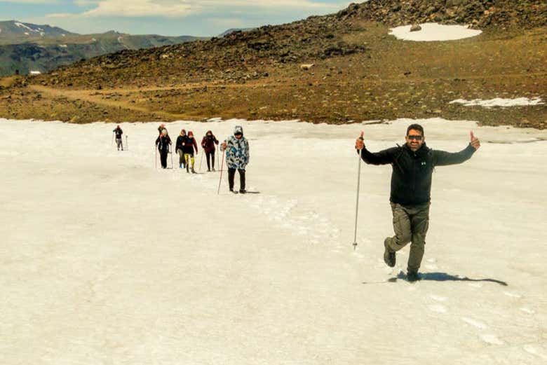 Cuando menos lo esperéis, llegaremos a nuestro objetivo: el hito fronterizo X-5, popularmente conocido como el Hito Copahue. Este punto es la frontera natural entre Argentina y Chile engalanada por picos nevados y un valle de colinas áridas. ¡Tendréis un pie en Argentina y otro en Chile! Por supuesto, nos dispondremos a saborear el éxito con una reconfortante bebida caliente antes de emprender el regreso.