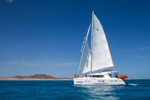 Comenzaremos a navegar por la costa norte de Fuerteventura dirigiéndonos a la isla de Lobos. Allí, fondearemos frente a la playa de la Concha para que podáis disfrutar de diferentes actividades acuáticas. Tendréis a vuestra disposición kayaks, tablas de paddle surf y gafas y tubos de snorkel ¡Hay opciones para todos!