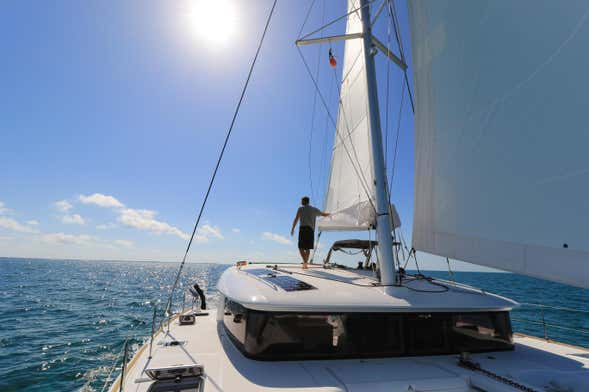 Nos reuniremos a la hora que seleccionéis en la calle Galicia, 30, frente al puerto deportivo de Corralejo para zarpar a bordo de un flamante velero catamarán. La embarcación alberga un servicio de barra libre a bordo con bebidas como vino, cerveza, refrescos o agua, que tendréis disponibles durante todo el trayecto.