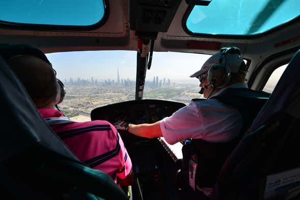 Si elegís este vuelo, obtendremos unas vistas privilegiadas del skyline de Dubái y sobrevolaremos la Palmera Jumeirah, el Burj Al Arab, el Burj Khalifa y The World Islands. ¡Quedaréis fascinados!
