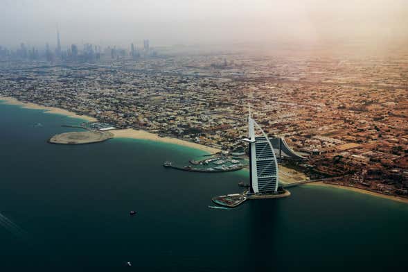 Una vez que hemos disfrutado del mismo itinerario que el tour de 60 y 75 minutos, seguiremos navegando por las aguas del Golfo Pérsico bordeando la Palm Jumeirah. Esta isla artificial en forma de palmera está repleta de selectos resorts turísticos. Los hoteles de Dubái son un monumento en sí mismos. Prueba de ello es el conocido Burj Al Arab, cuya silueta en forma de vela marina también divisaremos desde la lancha rápida.