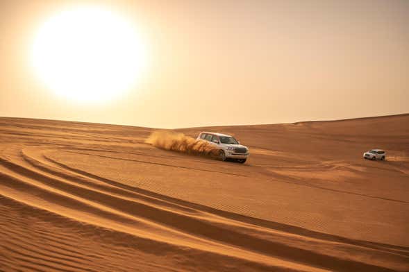 Cuando lleguemos a nuestro destino, descansaremos durante 20 minutos y, a continuación, subiremos de nuevo a un Land Cruiser 4x4 para disfrutar de una de las actividades más excitantes del día. A bordo de un potente todoterreno conducido por un piloto experto, recorreremos las dunas del desierto practicando derrapes y escalando estas imponentes montañas de arena. ¡Adrenalina pura!
