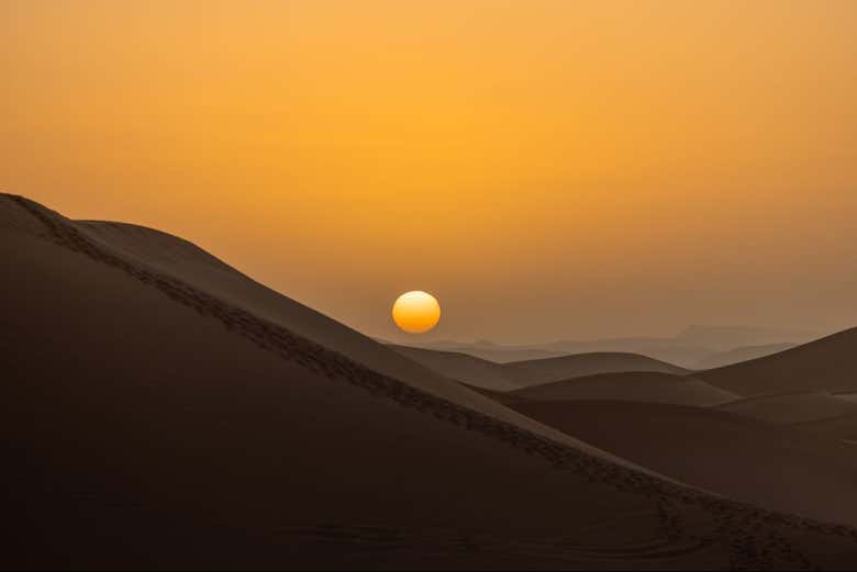 ¡Pero lo mejor está por llegar! Dependiendo de la hora que escojáis para hacer la excursión, comenzaréis a divisar en el horizonte del desierto los colores del amanecer o del atardecer. Naranjas, dorados, rosados... ¡La paleta de colores será increíble! Aprovechad el momento para tomar una foto. Aunque el mejor recuerdo, lo guardaréis en vuestras retinas.