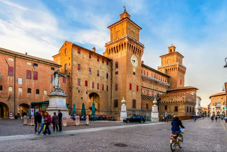 El recorrido comenzará en el patio del castillo de Ferrara, que podremos admirar desde el exterior. Símbolo de la ciudad por excelencia, fue construido como fortaleza y posteriormente transformado en residencia ducal de la familia Estense. Seréis testigos de la grandeza de su pasado contemplando sus terrazas, balcones e imponentes torres.