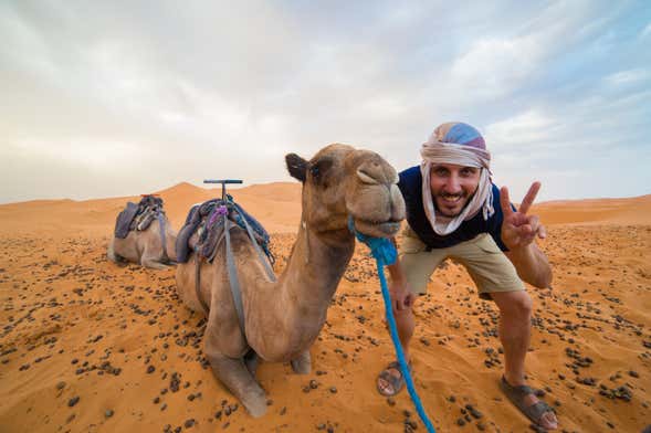 Continuaremos nuestra ruta atravesando el Valle y las Gargantas del Ziz hasta la bucólica Erfoud. Al atardecer daremos un paseo en camello por el desierto de Merzouga. Una vez repuestas las fuerzas con una cena bajo la luz de las estrellas, pasaremos la noche en un campamento de haimas.