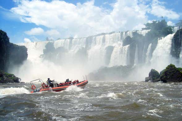 A bordo de la embarcación contemplaremos las Cataratas de Iguazú desde el agua y, acto seguido, navegaremos hasta el salto Tres Mosqueteros. Desde este punto hay una panorámica privilegiada de las cataratas argentinas y brasileñas. Llegaremos al incomparable salto San Martín, el segundo más grande del parque, con una caída espectacular de 80 metros. ¡Os acercaréis tanto que acabaréis empapados!