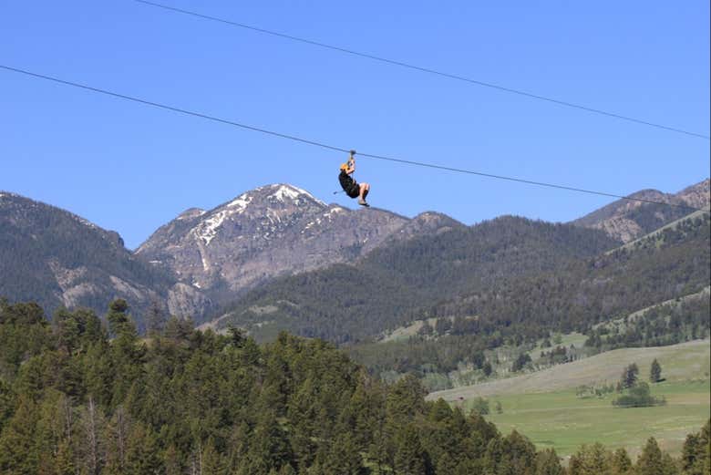 Mientras os desplazáis entre plataforma y plataforma, contemplaréis unas impresionantes vistas de la naturaleza virgen que rodea Yellowstone. Volaréis por encima de un arroyo de aguas cristalinas, atravesaréis zonas boscosas y podréis admirar la imponente silueta de las montañas de Absaroka a lo lejos.