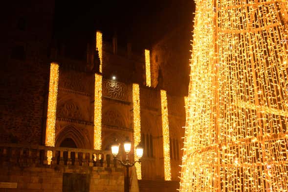 Pasaremos también por la plaza de Santa María de Guadalupe para maravillarnos con el alumbrado navideño y, por supuesto, nos detendremos ante la fachada del Real Monasterio, que estará iluminada con luces doradas. ¡Una imagen de ensueño!