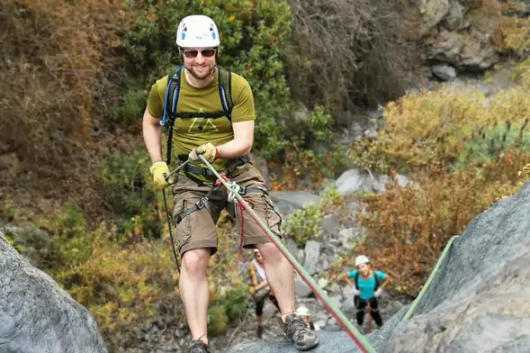 Después, llegará el momento de hacer rápel. Os explicaremos las medidas de seguridad que debéis respetar y repasaremos cómo utilizar las cuerdas para deslizarnos por las paredes rocosas del barranco de Guaria.