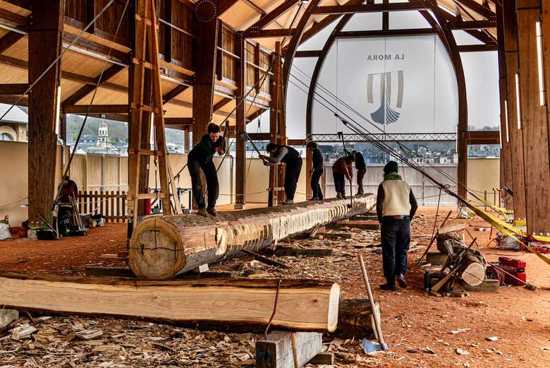A partir de las imágenes ofrecidas por el famoso Tapiz de Bayeux, un grupo de carpinteros y de otros profesionales está construyendo bajo una enorme nave este imponente barco normando.
