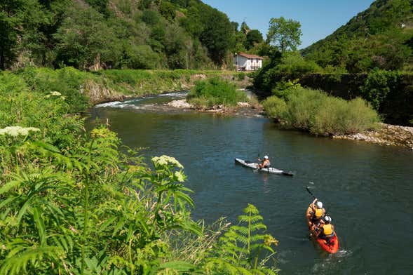 Nos subiremos a los kayaks y empezaremos a remar por el río Bidasoa desde Endarlatza. Durante el descenso del Bidasoa, recorreremos 7 kilómetros hasta alcanzar la localidad de Behobia. Durante la travesía, veremos los verdes paisajes del País Vasco y conoceremos los detalles de este importante río, frontera natural entre España y Francia.
