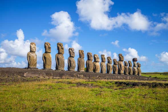 Exploraremos la Isla de Pascua con este completo tour que os llevará hasta los moáis de Ahu Tongariki y a la playa de Anakena, pasando por la cantera del volcán Rano Raraku. ¡Imprescindible!