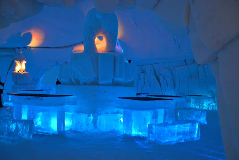 Al llegar a este pequeño pueblo helado, disfrutaremos de un sabroso almuerzo tipo buffet. Con el estómago lleno, haremos un recorrido a pie para descubrir las construcciones hechas de hielo. ¿Sabíais que cada año se realizan edificios diferentes? Os contaremos cómo los talentosos diseñadores crean sus obras en función de la climatología para que aguanten más tiempo en pie.