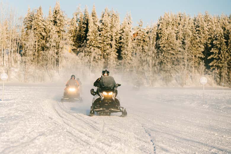 Durante la ruta en moto de nieve, recorreremos un total de 40 kilómetros. Atravesaremos los bonitos bosques nevados de Laponia para alcanzar nuestro destino, el monte Kätkä. Con un poco de suerte, y a medida que vayamos avanzando en estos potentes vehículos, avistaremos algunos de los animales que habitan en la zona, entre los que destacan los renos.