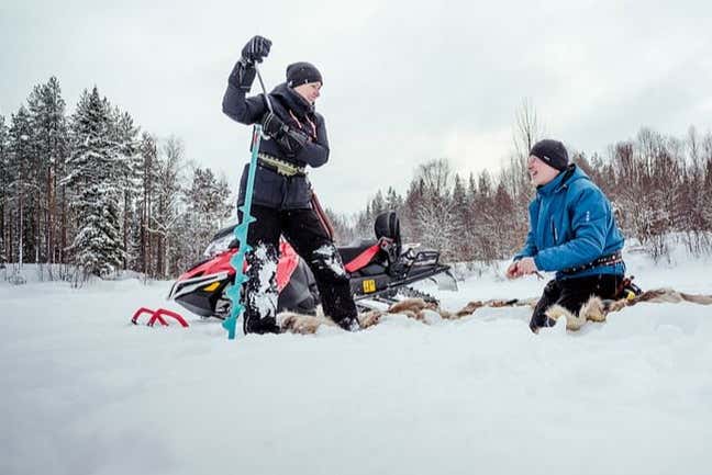 Tras disfrutar de los maravillosos paisajes finlandeses, nos bajaremos de las motos de nieve y comenzaremos la actividad. Realizaremos un agujero en el hielo de la laguna y esperaremos pacientemente hasta que los peces piquen el anzuelo. Además, os desvelaremos todos los secretos y técnicas para convertiros en especialistas de este deporte.