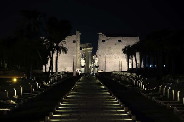 El espectáculo de luz y sonido del Templo de Karnak dura dos horas, durante las cuales realizaremos un recorrido para admirar esta impresionante obra arquitectónica desde una perspectiva distinta hasta llegar al Gran Lago Sagrado. Aquí, tomaremos asiento y contemplaremos el espectáculo de luces mientras el templo se ilumina ante nuestros ojos.