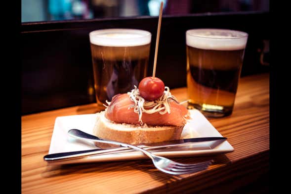 Durante la ruta, haremos tres paradas y probaremos una selección de estos pequeños bocados en miniatura, degustando varios productos típicos como los pimientos de Padrón, setas tradicionales, jamón y embutidos ibéricos maridados con vino, carrileras y puré de patatas con vino...