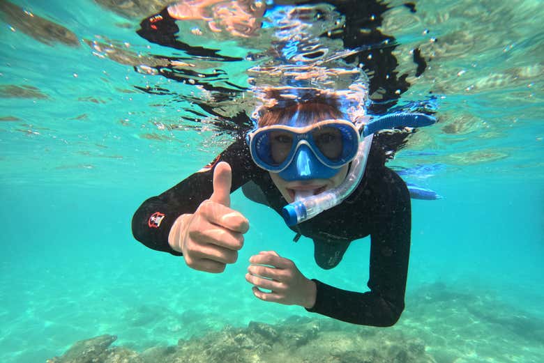 Equipados con las máscaras, tubos y aletas, realizaremos una inmersión de entre 40 y 50 minutos. Acompañados por un buceador experto, nos sumergiremos a baja profundidad, sin necesidad de utilizar botellas de oxígeno u otro material de submarinismo.