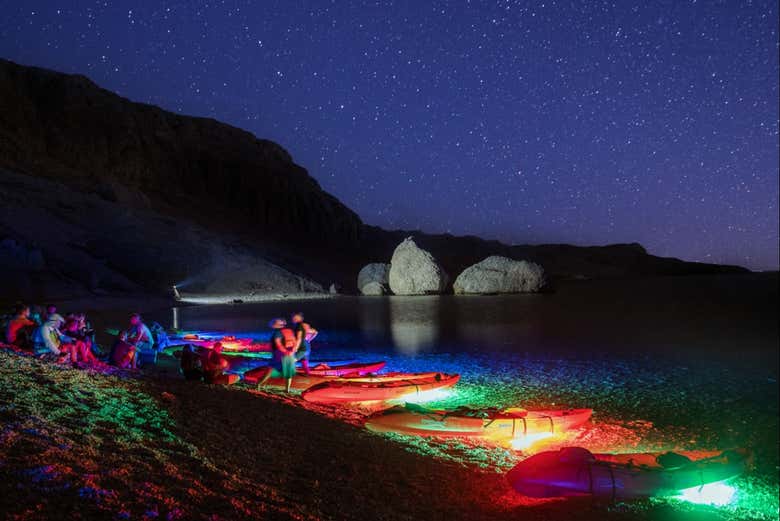 Continuaremos el tour frente a la playa de Slana, donde haremos una breve pausa para disfrutar de las vistas del reluciente fondo marino gracias a las lámparas de colores que iluminarán el agua bajo los kayaks.
