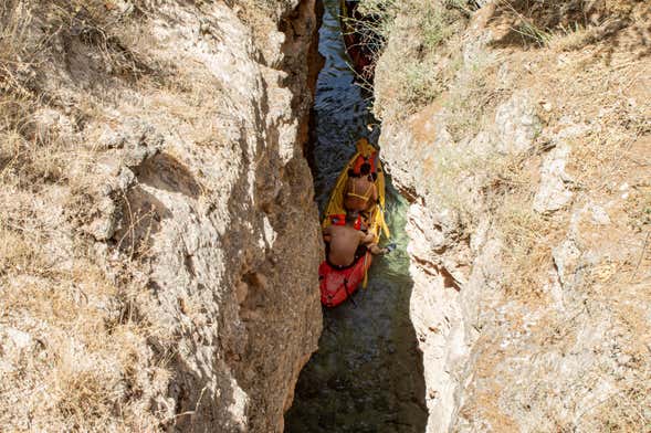 Para volver, atravesaremos la grieta Chorro de las Minas, un paso muy especial que convierte a esta ruta en kayak en una de las mejores de las Lagunas de Ruidera.