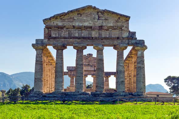 Las ruinas de Paestum, declaradas Patrimonio de la Humanidad, aún conservan el legado de una destacada ciudad de la Magna Grecia. Iniciaremos el recorrido por esta antigua urbe grecorromana contemplando los templos de Neptuno y Hera, que destacan por sus impresionantes columnas dóricas.