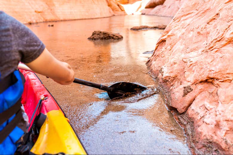 Al llegar, nos equiparemos con todo el material necesario para la actividad y, tras una breve charla sobre el manejo de las embarcaciones, comenzaremos la ruta en kayak. Durante la actividad, remaremos por las tranquilas aguas del lago Powell para admirar desde una perspectiva única las enormes paredes del Cañón del Antílope.