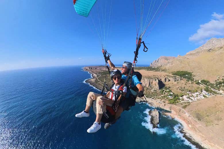 Subidos al parapente y firmemente anclados al piloto, daremos una pequeña carrera y emprenderemos el vuelo... ¡Sicilia a nuestros pies! Durante unos 20 minutos podremos admirar los impresionantes paisajes de la isla a vista de pájaro. Podremos admirar la majestuosidad de la Reserva Natural del Zingaro, las aguas cristalinas del Mediterráneo y la playa de San Vito Lo Capo.