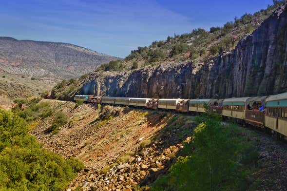 Nuestra excursión al Valle Verde continuará sobre ruedas, pues nos subiremos al emblemático Tren del Cañón Verde. Desde nuestros cómodos asientos podremos contemplar unas vistas únicas del Valle Verde mientras conocemos la historia de este ferrocarril de más de 100 años y tomamos el aperitivo. Parecerá que podemos tocar con nuestras manos las imponentes paredes de cañones de roca roja, y a 600 metros de altura nos acercaremos a Sedona y a las aguas del río Verde mientras disfrutamos de un almuerzo.