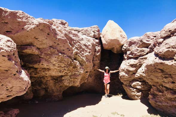 En primer lugar, subiremos con el 4x4 hasta la cima de un cerro para observar unas magníficas panorámicas del desierto de Atacama. Tras disfrutar de las vistas, emprenderemos una ruta de trekking por el desfiladero del Salto del Chintaguay. En esta caminata de dificultad media recorreremos unos 2 kilómetros.