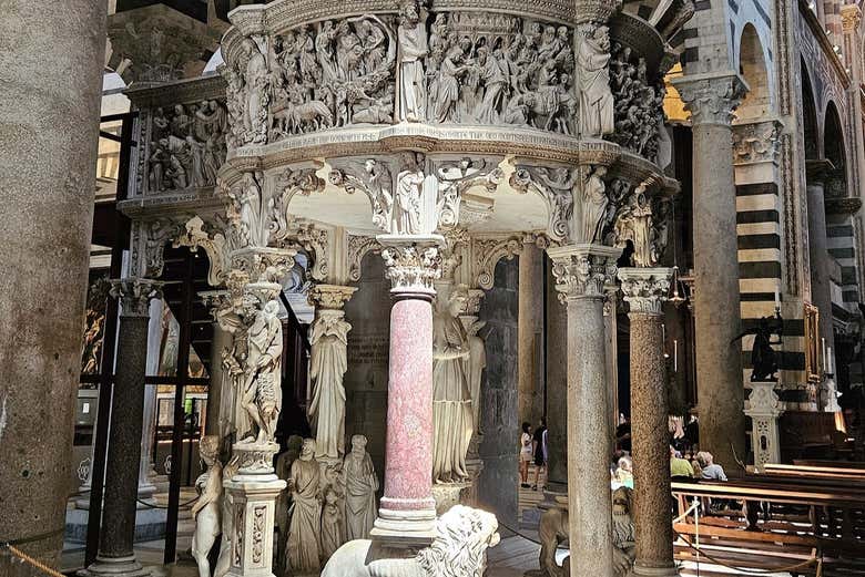 La entrada sin colas a la torre inclinada también os permitirá visitar la Catedral de Pisa por libre. Si su aspecto exterior ya impresiona, en su interior encontraréis un excepcional patrimonio artístico. Os recomendamos especialmente prestar atención a las esculturas de las cariátides que representan las virtudes, el púlpito, al altar mayor y el sobrecogedor mosaico del ábside, entre otras obras destacadas.