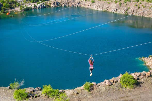 Incluye un circuito con 5 tramos de 700 metros, que alcanzan un promedio de altura de 40 metros. ¡Toda una descarga de adrenalina sobre el embalse Potrerillos!
