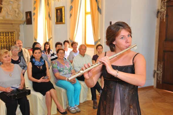 El palacio fue construido en estilo renacentista y reconstruido posteriormente con un estilo barroco más austero. La sala de conciertos de estilo barroco del XVII tiene capacidad para 100 espectadores.