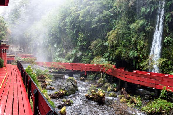 Recorreremos las diferentes pasarelas situadas junto a los baños termales. Estos caminos nos permitirán contemplar la forma geométrica de las piscinas y admirar el precioso entorno en el que se ubican. Todo el conjunto está situado en un extenso espacio natural, donde también veremos una hermosa y verde vegetación autóctona, un pequeño riachuelo y una cascada que vierte sus aguas en las termas.