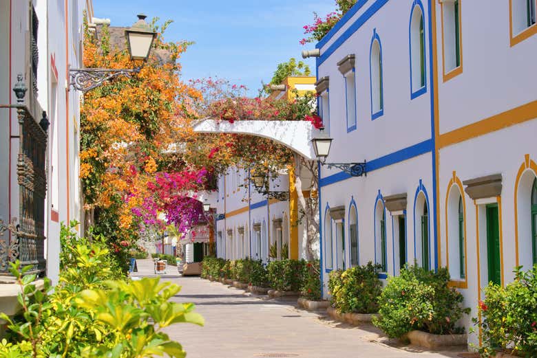 Concluiremos este paseo en catamarán de dos horas en Puerto de Mogán, conocido como la Venecia de Canarias por su pintoresco conjunto de canales y de casitas blancas decoradas con ribetes de colores y buganvillas de color violeta.