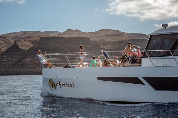 Tras pasar a recogeros por vuestro hotel del sur de Gran Canaria, nos desplazaremos en autobús hasta el muelle de Puerto Rico, donde zarparemos a bordo del catamarán Afrikat 69.