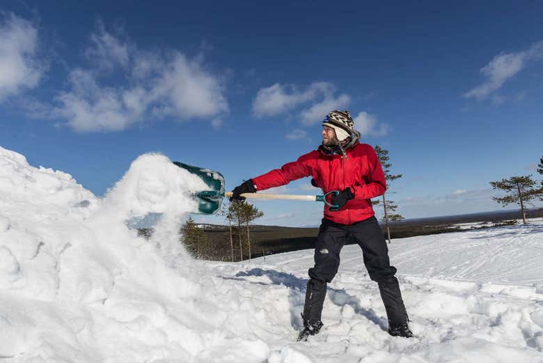 De nuevo con energía, cogeremos las palas de nieve y nos dispondremos a construir un quinzee, el típico iglú lapón. Nos sentiremos como auténticos esquimales mientras excavamos este refugio blanco. ¿Sabíais que este método es utilizado por los excursionistas para sobrevivir a las noches árticas?