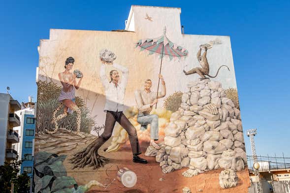 Después, empezaremos a divisar algunos ejemplos del arte callejero de San Antonio. Artistas nacionales e internacionales como Phlegm, Interesni Kazki, Pablo Herrero o David de la Mano han aportado su granito de arena a las fachadas de los edificios de esta ciudad. Obras con aire crítico, como La Revolución o Capitalismo que, seguro, no os dejarán indiferentes.