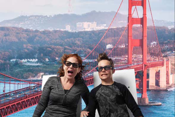 ¿Cómo? Sentados en vuestras butacas, “despegaréis” mientras la pantalla envolvente gigante empieza a funcionar y vuestros asientos os llevarán a elevaros y a sentir los efectos del viento mientras pasáis sobre el imponente Golden Gate, Muir Woods, Chinatown y muchos de los puntos más emblemáticos de San Francisco.